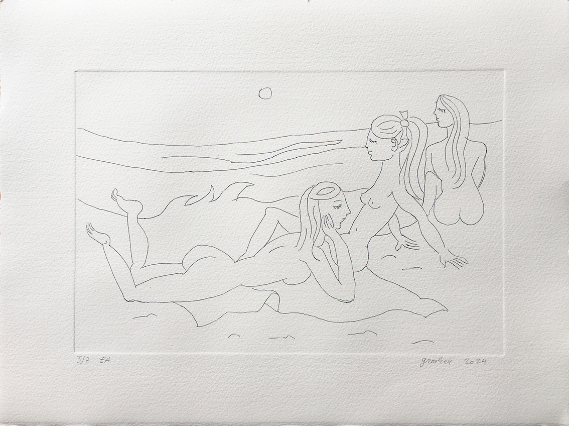 Dans cette estampe réalisée en 2024, trois baigneuses s’étendent et se tiennent au bord de la mer, leurs corps déliés dialoguant avec les ondulations de l’eau. L’une est allongée, la tête appuyée dans la paume de sa main ; une autre est assise, tournée vers l’horizon ; la troisième se tient debout, le dos tourné, comme absorbée par quelque chose au loin.