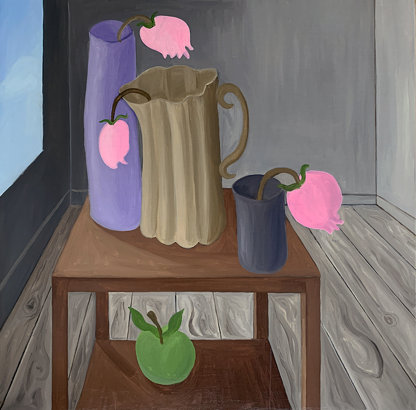 Cette peinture met en scène une nature morte silencieuse : trois vases aux formes épurées contiennent des fleurs fanées aux pétales roses, tandis qu’une pomme verte repose sur la tablette inférieure. L’ensemble, baigné d’une lumière douce venue d’une fenêtre, évoque le passage du temps, la fragilité du vivant et la beauté discrète des choses simples.