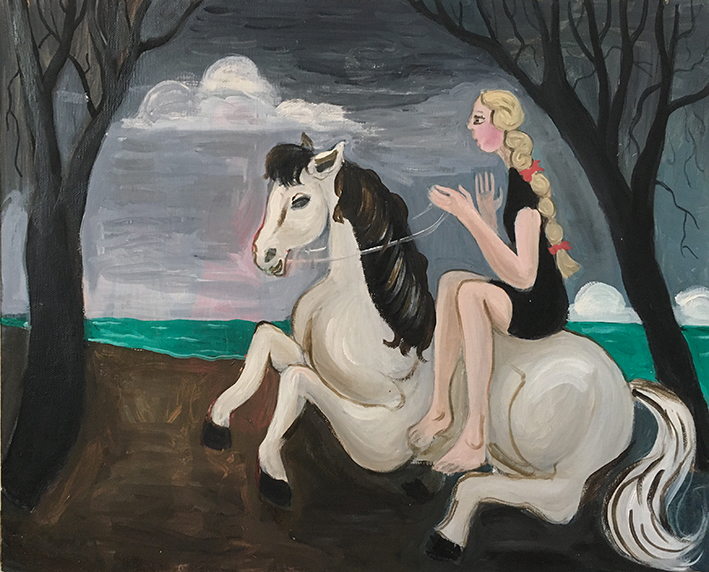 Dans Promenade à Saint-Palais, l’artiste nous convie à une scène onirique, suspendue entre nuit et jour, réalité et songe. Une jeune cavalière, pieds nus et vêtue de noir, chevauche un cheval blanc au galop figé, le regard tourné vers l’horizon marin. Sa longue tresse blonde ornée de rubans rouges évoque à la fois l’enfance et une forme de rituel silencieux. Le duo se déplace à travers un paysage crépusculaire : arbres nus, ciel chargé de nuages, mer turquoise tranchant avec la terre sombre. L’ambiance est presque mythologique, comme si cette promenade était celle d’une héroïne oubliée, arrachée au temps.